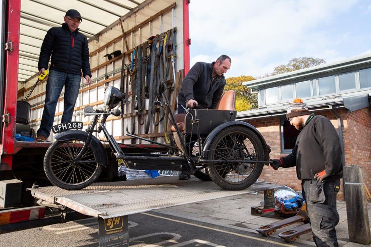 Vehicles being unloaded and prepared for exhibition at Beamish.